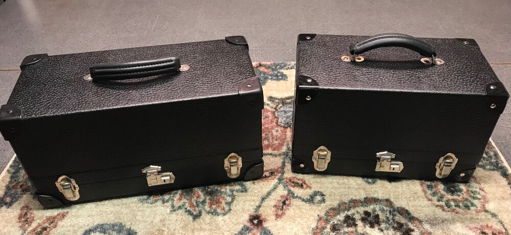 Both cases have Hair Cell bonded leather outer covering and original Eagle hardware. The 6 drum carrier has leather corner protectors and all black rivets. The 5 drum carrier has metal corner protectors and nickel plated rivets.