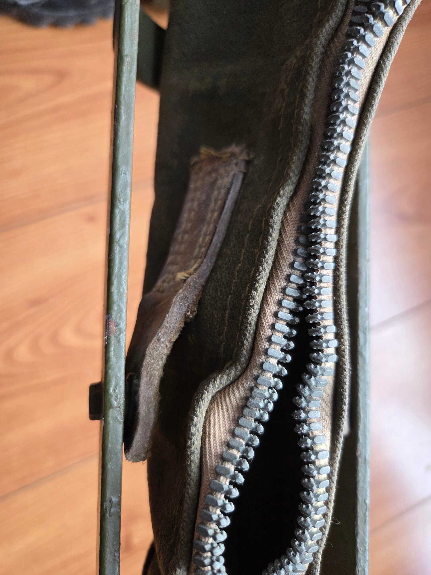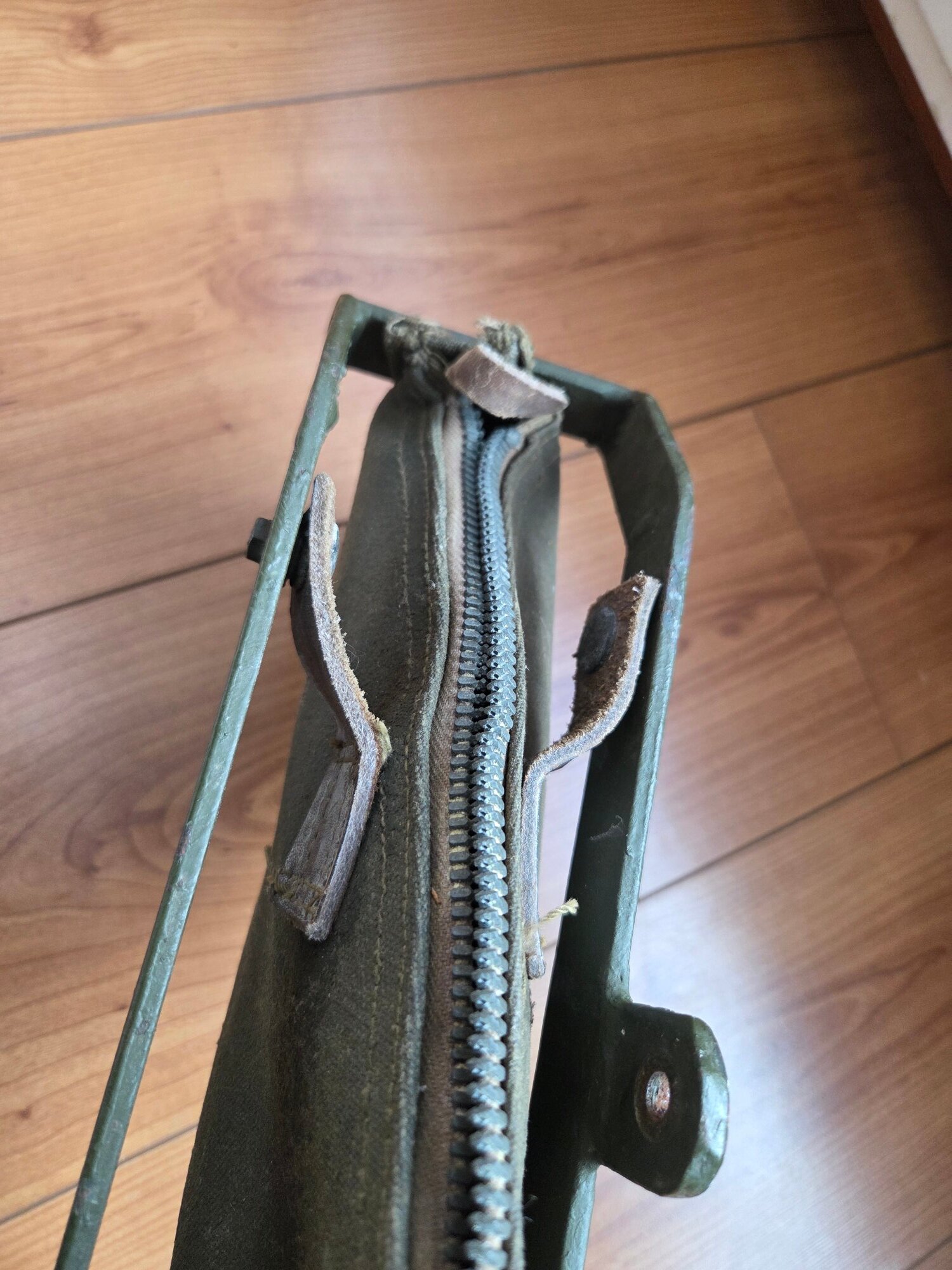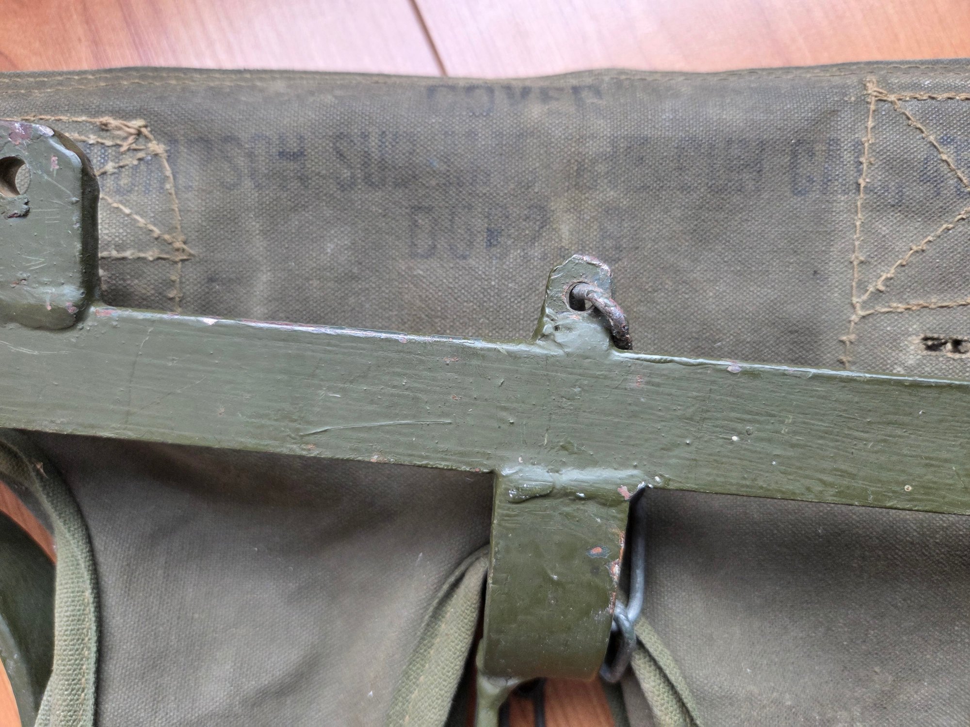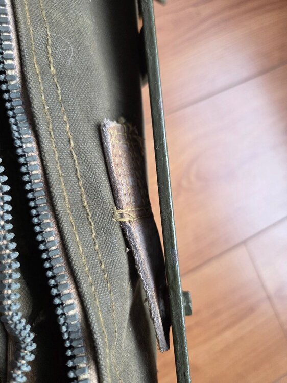 Here are a few of clearer photos of the leather tabs attached to the frame Rear And two showing the front tabs, left and right. And very faded markings on mine, which has been used and abused during its lifetime.