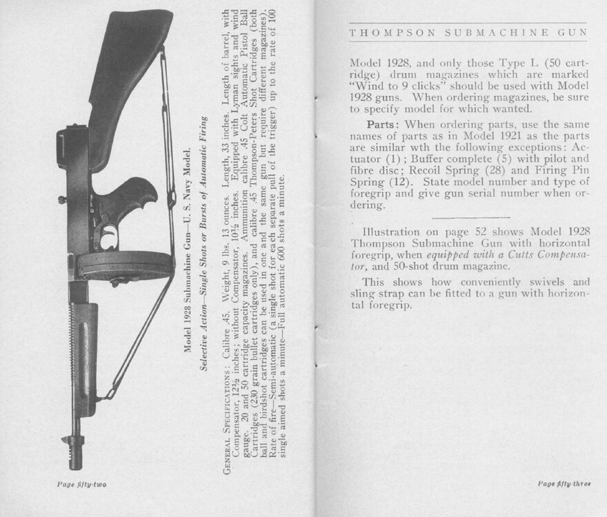 "M1928 or M1921/1928 Overstamp (USN) Thompsons". As these photos were taken in the 1930's they would be M1921/1928 Overstamp. No Model of 1928's were manufactured as such until Maguire took over AOC and contracted Savage to begin manufacture of the Model of 1928s. All Thompsons prior to that would have originally been manufactured as Model of 1921s by Colt in 1921/1922, and subsequently modified to create Models of 1923, 1927 and 1928s. -