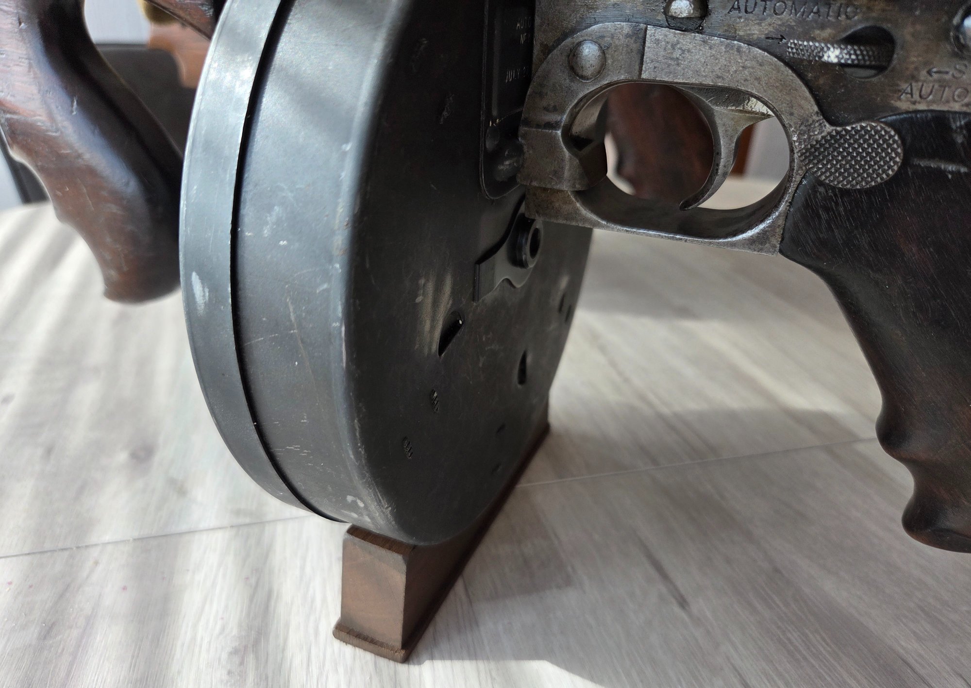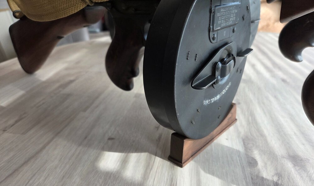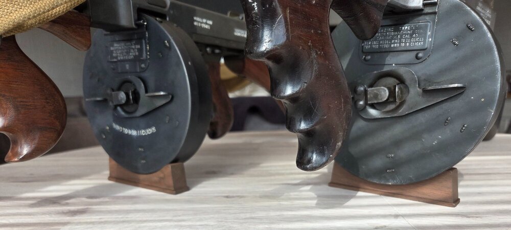 Balder, That is excellent improvising, A+ from me. The ability to survive depends on the ability to adapt, they say. If you look at the first 'improvised display' in the post, I had no display stands. So for the next one, with a little more planning, I was improvising myself. If you look at the photo and post on the June 15, 2025, I made some crude, but effective, display stands for TSMGs fitted with XX mags. Made from spare wood l had lying around my garage, see subsequent posts, dated July 22 & 23, 2025. I also had two Denix display stands for the Model of 1921 and one of the Model of 1928's fitted with an 'L' drum, which are a good design. These clearly show the drum and their markings. I tried to find more Denix display stands in the UK, without success. However, fellow forum member, cincylance, came to my rescue with his excellent display stands, for the next display. They are very discreet, but well made and sturdy. They don't distract from the Thompson guns iconic silhouette, fitted with the 'L' drum. For the next display, I now have two cincylance display stands, so I can display the other two Model of 1928's, wth two more 'L' drums. There is always room for improvement. 👌 -
