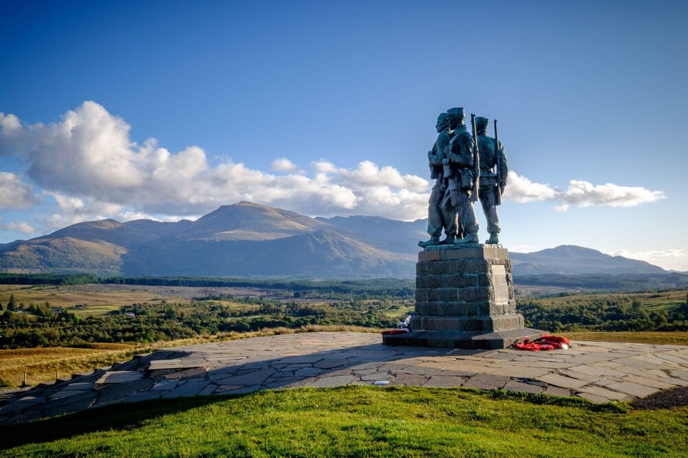 Another view of the memorial from a different angle, showing the third commando. With some beautiful Scottish landscape behind it.