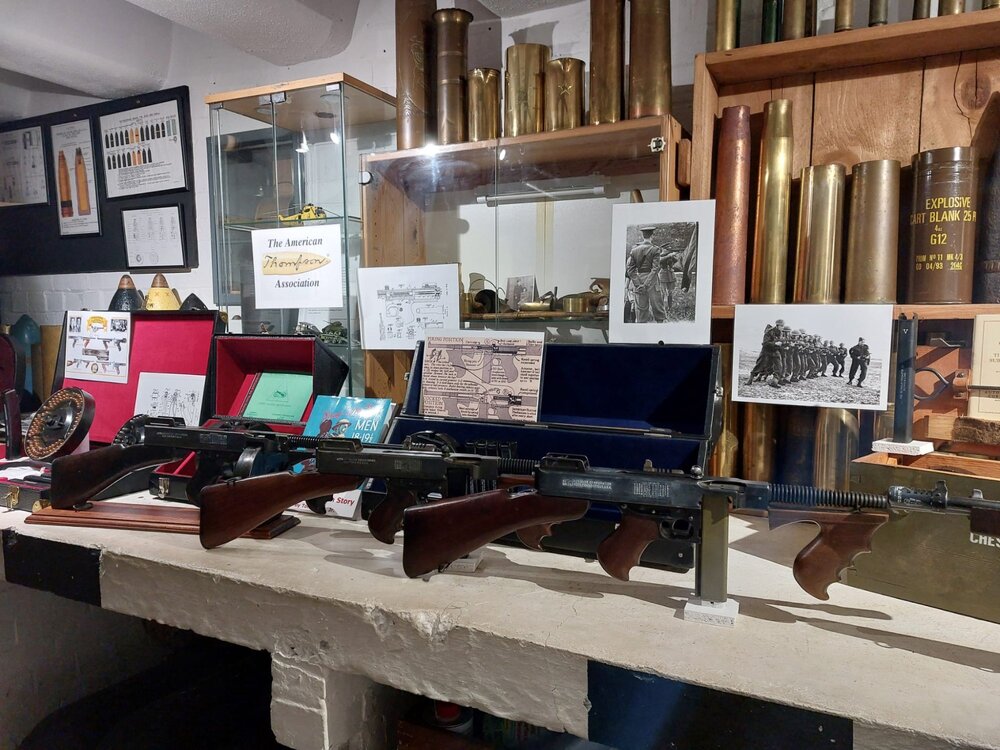 My daughter and her boyfriend visited the display on Sunday, and the WW2 homeguard photo was one I laminated for the display. When she saw my wife and I in the garden shed, Elaine doing her dress making, and me oiling the TSMG, my daughter said the scenario reminded her of that photo. I hope I don't look as old as that HG Sgt.!! Few more pictures below of the display, first day just after setting everything up, prior to the museum opening and the visitors arriving. This time around I was better prepared, with the weapon / magazine display stands I run off from left over wood, I had lying around the garage, and the two drums with perspex covers to demonstrate the filling, ( and weight) of the drums. I also had a go highlighting the weapon and magazine markings. To complete the display and to tell the story, I added some laminated photos and copies of patents etc. As well as the 'TATA' logo, with Tracies permission, we also had on display a copy of Tom Davis's book 'Great Britain - The Tommy Gun Story', which Tom was kind enough to donate for the display, together with a copy of his reproduction of the Fort Knox manual; and the 'V' marked 30 rnd Seymour mag I was able to add to my collection earlier this year, thanks to a couple of members on the forum. ? Toms book, 'Great Britian - The Tommy gun story', was donated to the museum library on the Sunday, at the end of the display. My efforts were well worth it as a lot of museum visitors were very interested in the display, indeed some having seen the museum adverts for the display had travelled just to see it. My thanks go to all the forum members who have helped me put this display together, you know who you are, and without your help the display would not have been as complete.