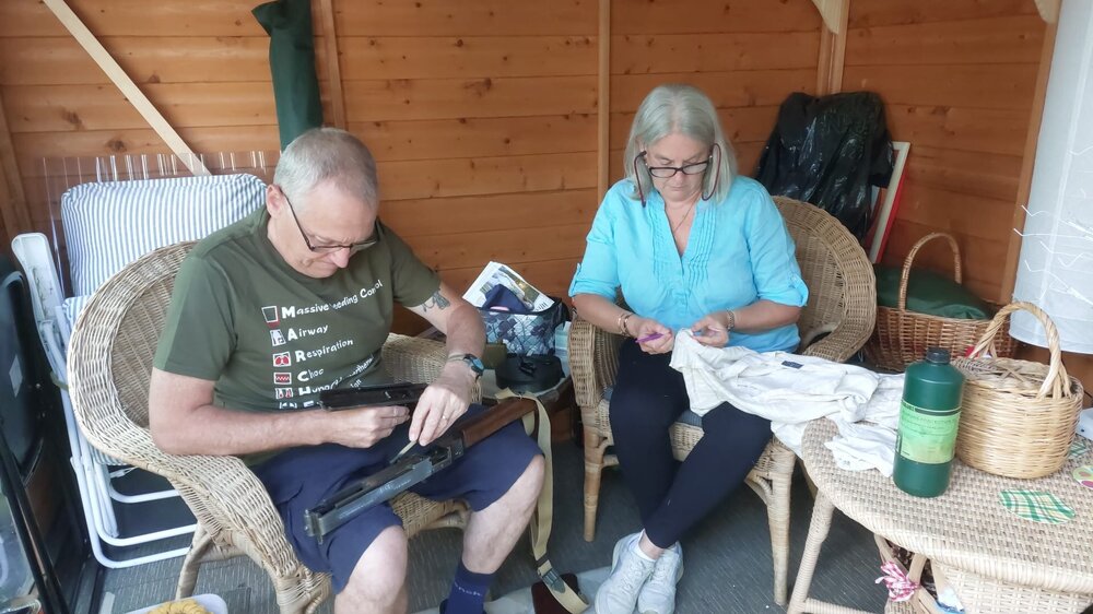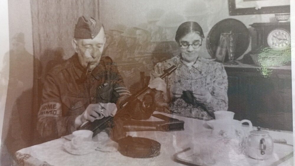 Last weekends 'Great Britain The Tommy Gun Story' display went well, displaying the evolution of the Thompson from the 1921 through to the M1A1. On the way highlighting both British armourers modifications and the wartime time and cost cutting measures on the 1928A1s. Weekend went well with a lot of interest and was enjoyable. Today I've been catching up on things, including cleaning and oiling of the Thompson guns after their weekend on display. My daughter took a photo of my wife and me. England 2025....that reminds me of a war time photo.... England 1940...? Five down, three to go. To think when I was serving, weapons cleaning was a chore, now it is therapeutic.?