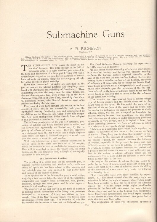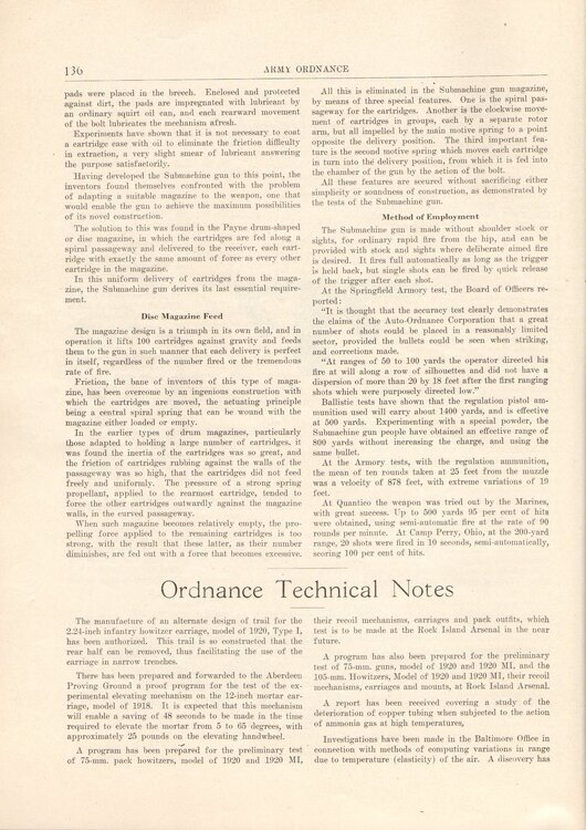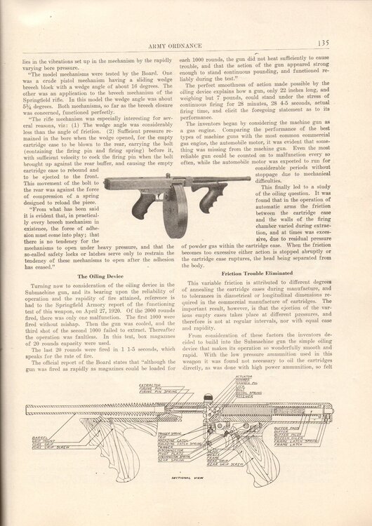 Ordnance, that is a nice idea. Below is the article from the Nov / Dec 1920 edtion. Note the discussion on the Breech-lock Problem on page 134 above. Note 'Method of Employment' on Page 136 above: "The Submachine gun is made without shoulder stock or sights, for ordinary rapid fire from the hip, and can be provided with stock and sights where deliberate aimed fire is desired". On the same page, when discussing "suitable magazine to the weapon", The "Payne drum-shaped or disc magazine" is mentioned, and "Disc Magazine feed" title below that. So, I am guessing the term 'drum' magazine, had not been settled upon at that stage? Enjoy the read and have a good weekend, especially those at the All Thompson Show and Shoot? -