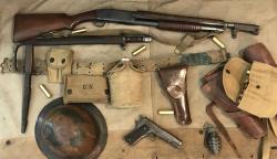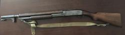 I apologize if you have seen this on other forums but I am trying to cast a wide net. Got this shotgun some time ago and I think it is the real deal but I'd like people who know what they are looking at to give me their opinions. It cost quite a bit less than what I have seen on auction sites lately because someone (possibly the govt) had cut the barrel. A previous owner put a barrel extension on it to take it back to 23 inches. I was told the bayonet lug/adapter has been with it through several owners and might be original to the gun. The eagle head mark is very difficult to make out. The top wood guard was missing and I have been trying to replace it. Got a repro on there now but the color of the stain is a work in progress. A rear bracket was on there but I am using a repro on it right now. Using Mr. Canfield's book, the serial number is in the " tends to fall in" range - 163,xxx. The US and flaming bomb look good on the correct side of the receiver. There is a hole near the muzzle where the set screw for the bayo lug goes. Mr. Canfield writes that there is supposed to be three transverse grooves for bayo adapter but mine does not have that - I thought that I read somewhere that these don't have the grooves and that is what the set screw was for - to keep the adapter from turning under stress? Can anyone confirm that? The sling swivels look good compared to photos I have seen. Any comments or opinions would be greatly appreciated. This is the only one that I have ever seen in person. If you need to see more photos please let me know. Best, John