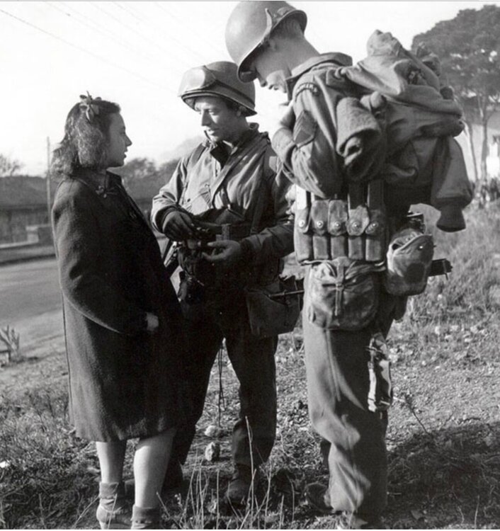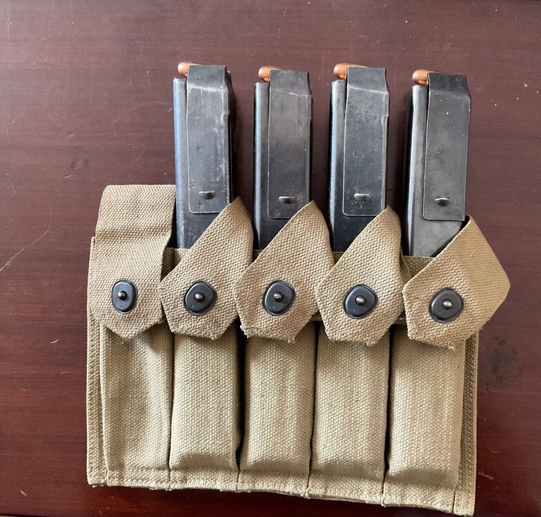 I appreciate the replies. I should have been clearer. I realize the guy on the left in the photo has to have had a Thompson and those are 30 round Thompson mags in the pouch. You guys saw a lot more detail. Seeing this photo made me wonder if, except for the D90242 tanker bag/pouch or using a gas mask bag or GP bag, the guys carrying M3s in WW2 used the Thompson 5 cell? Weren’t the three cell M3 pouches post WW2? I don’t have a real grease gun - maybe in the future - but I dug out four of the mags. When I put my grease gun mags in a Thompson pouch they fit all the way into the pouch and don’t snag on the way out if I pull the lift-the-dot fastener. Of course, the M3 mags in the pouch and hanging out that much are likely to get snagged on brush, branches, etc. but then so are the slightly shorter 30-round Thompsons. -
