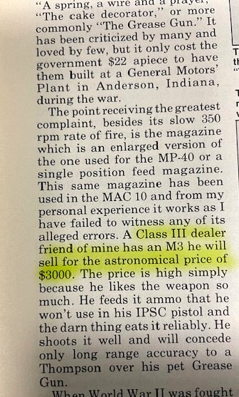 From 1987, I love reading the old publications from the 1980s...totally different vibe in those days. $3k WAS a lot for an M3 back then, they were always priced slightly higher than military Thompsons, primarily because there are fewer of them available.