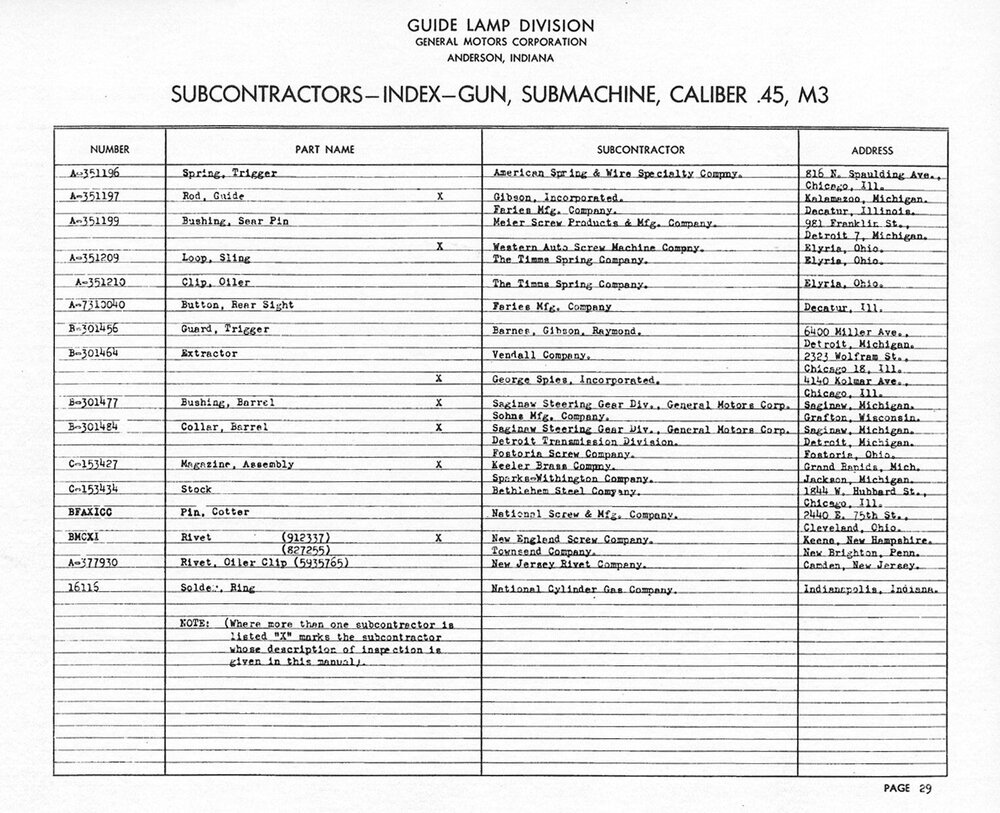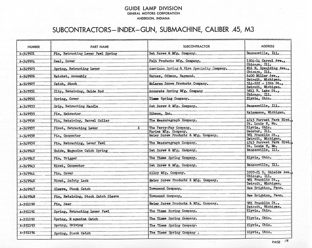 Attached are pages from an M3 Ordnance publication at the National Archives II in College Park, Maryland. There is also one for the M3A1, but I didn't copy it. The publications are a complete guide on how to manufacture an M3 submachine gun, drawings, parts lists, labor hours, material etc. The attached lists are of WWII subcontractors. As mentioned earlier, there were a large number of post-WWII subcontractors used to support the weapons during the Korean War, Vietnam War, and up to the year 1999, when they were still issued to reserve armor units. A post-war example is magazines not listed, made by Ithaca (ITG) for their post-war production of M3A1s, and Jahn (J) who had a contract for magazines during the Vietnam War. Jahn magazines have a green phosphatized finish and are fairly common and found still new in the wrap. Jahn also made 30-round magazines for the M1-M2 carbines. To answer your Marlin barrel question, yes the same company that made sporting firearms -
