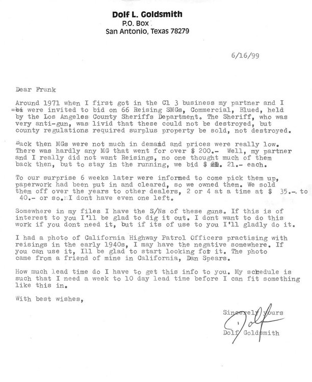 I was sorting old research documents and found this letter from Dolf Goldsmith dated 1999. In 1971, he bid on 66 Reisings and won them with a bid of $21.00/each and sold them for $35.-$40.00. Today's value? $500k + I recall seeing Reisings for sale in the mid 1980s for $165.00, however, the general mindset was " I am not paying a $200.00 tax on a $165.00 gun". I bought my first Reising in 1991 for $695.00.