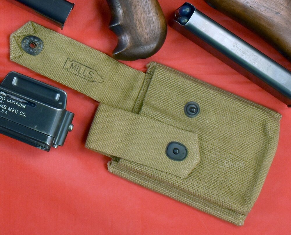 The Moor, I find it an interesting piece of canvas. I recommend identifying the actual police department and the serial number of the "M1921A" Thompson submachine gun. I would seek a letter from the seller with this information. All documentation with any unusual piece like this is very important. I want to know when that Model of 1921A was shipped by Auto-0rdnance. Could there be a newspaper picture of policeman wearing this magazine pouch showing off the then "new" Thompson submachine gun? It is certainly worth the search, but you need to provide the starting point with information from the seller. Before the Mills Belt Company went out of business in 1930, they very well could have designed this pouch and provided the drawings to the Auto-Ordnance Corporation. Given the Mills company propensity for marking canvas items, it is hard to believe they would have let an actual canvas piece like this leave the factory with no markings. If a sample piece by Mills was provided to Auto-Ordnance, it would not be surprising Auto-Ordnance later sold it. When the inventory of Mills manufactured items was depleted, Auto-Ordnance turned to the Russell Manufacturing Company (RUSCO) to manufacture canvas items. The first evidence is in the 51 Pine Street Auto-Ordnance catalog with the introduction of the 5-cell magazine (marked) pouch with individual flaps. While Mills items are also pictured in this catalog, all references to the Mills company were removed. Let's not forget that Mills did manufacture a magazine pouch with individual flaps. Is there any similarity to this unmarked 5-cell pouch to the 2-cell Mills shot shell pouch? Those with my book, Thompson: Colt's, West Hurley's & More, may recognize this Mills shot shell pouch in the cover photograph. The Moor, you have something that may be very special. Let's do some research and see what turns up. -