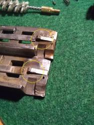 1. Good evening all, I'm trying to get my great grandfathers Westernfield 36 (Stevens 520) back into action and fully functional. It was passed down to me recently and has largely sat under a bed for what I would guess at least the last 40-50 years. Doing some googling leads me to believe it was manufactured in 38-39 (https://www.gunvaluesboard.com/stevens-520-and-520a-identification-guide-2617.html) After a thorough once over and cleaning (im talking pins and springs, this thing was gunky!) there is nearly no rust, and she is smooth as glass after nearly a century of use (im told many Michigan white-tail and pheasant met their end to this old girl). Forgive my poor cell phone pictures My problems started at the first trip out to the range. When going to rack the slide, ive noticed that the next shell has skipped over the shell stop and jammed the action, this is entirely from the recoil, not racking the slide: The normal shell position for proper feeding function is this(I assume): In taking things apart, my first thought was that the slide (https://www.gunpartscorp.com/products/1032990A) was worn down, allowing the shell to skip over the "shell stop". I ordered a new slide from numrich, and sure enough the new piece looked far less worn on the front end: (new part is on the bottom, notice the harder angle at the end of the little shell catch ramp) Thinking I had this thing figured out, I went back to the range today only to have the same issue. Once every 15-20 rounds the shell will skip over the little stop on the slide and jam things up. Im shooting #8 2 3/4 shot, nothing fancy, factory shells. While this is a cherished family heirloom, its always been a working shotgun, and I would like to take it out a few times a year hunting small game, maybe turkey, etc. But I dont want to if I cant count on a follow up shot. Any thoughts? I appreciate any insights you might have!