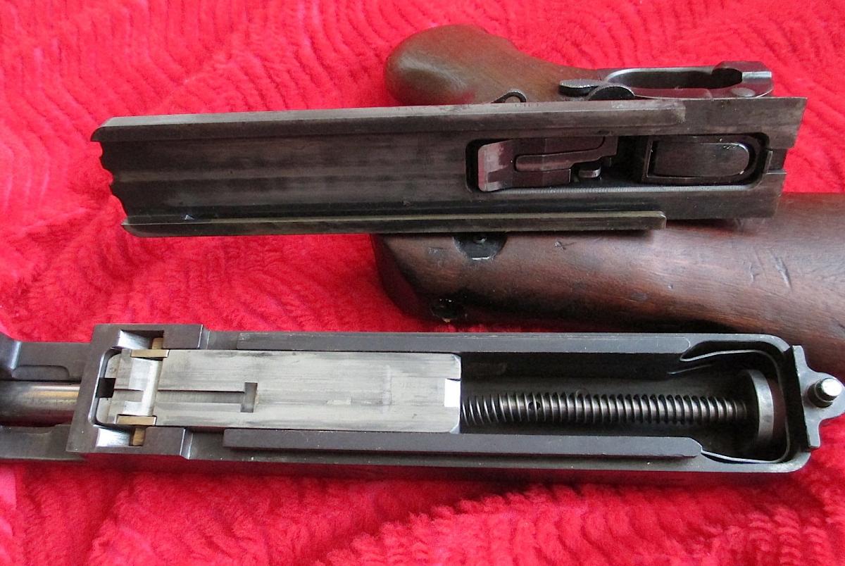 TD. Posted February 21, 2014 Report Share Posted February 21, 2014 That is certainly a low numbered Savage Thompson with a New York address on the right side of the receiver. Serial numbers for the Savage Thompsons started in the 15,000 serial number range so it is easy to do the math. As Darryl states above, the fire control lever and magazine catch are not correct. It would be interesting to know if the frame serial number matched the receiver. The L type rear sight and re-enforced butt stock are not correct and another indication this Thompson has been rebuilt in the past. The vertical fore grip also looks like a modern reproduction. The markings could probably be deciphered with a copy of American Thunder II. Thank you for sharing! Link to comment Share on other sites More sharing options...