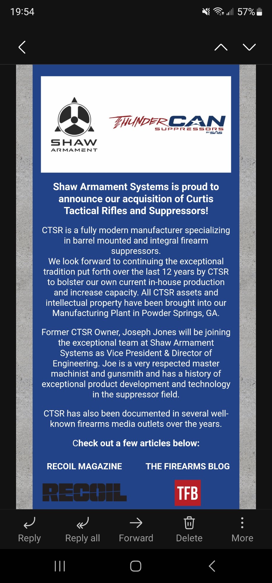 Rekraps Posted August 20, 2023 Report Share Posted August 20, 2023 19 minutes ago, StrangeRanger said: They were sold to Shaw Armament Systems Oh well, another great supplier says goodbye. Ugh. Link to comment Share on other sites More sharing options...
