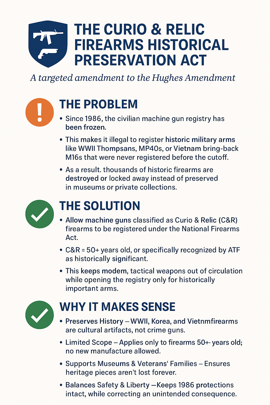 signal_4 Posted September 24, 2025 Author Report Share Posted September 24, 2025 Draft Bill Text (Amending 18 U.S.C. § 922(o)) SECTION 1. SHORT TITLE. This Act may be cited as the Curio and Relic Firearms Historical Preservation Act of 2025. SECTION 2. AMENDMENT TO TITLE 18, UNITED STATES CODE. Section 922(o) of title 18, United States Code, is amended— In paragraph (2), by redesignating subparagraph (B) as subparagraph (C); and By inserting after subparagraph (A) the following new subparagraph: “(B) This subsection shall not apply to any machinegun that— (i) is classified by the Attorney General as a curio or relic under section 478.11 of title 27, Code of Federal Regulations; and (ii) is lawfully registered in accordance with the National Firearms Act.” SECTION 3. EFFECTIVE DATE. This Act shall take effect immediately upon enactment. Link to comment Share on other sites More sharing options...