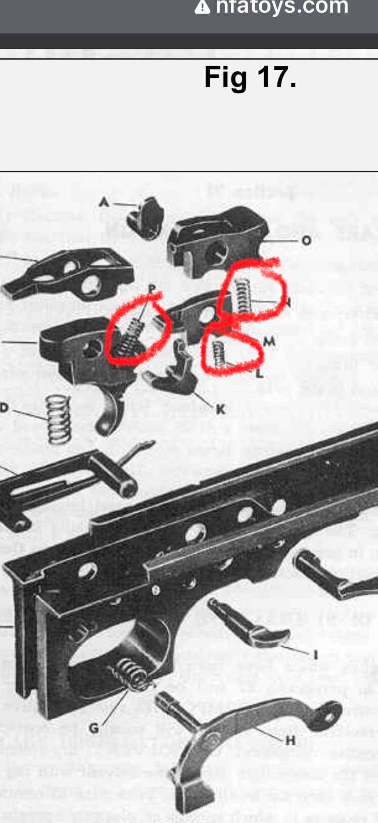 walleyealx Posted October 2 Author Report Share Posted October 2 12 hours ago, Bridgeport28A1 said: http://www.nfatoys.com/tsmg/web/m1assy.htm Your rocker appears to be in the correct orientation. Did you take the springs out of their respective parts when you were giving it a good cleaning? I attached a picture of the springs that I replaced. Maybe one of them is incorrect or too strong? 11 hours ago, deerslayer said: Push the rocker forward by hand while its apart and your fully squeezing the trigger. You can see if the trigger resets properly when you release. The rocker is there so tight that I can’t push it to do anything. It’s pushing against metal, whether or not the trigger is pulled. Link to comment Share on other sites More sharing options...